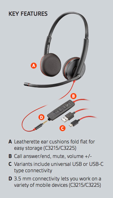 The Blackwire 3200 Series corded UC headsets are durable, lightweight, easy to deploy and come in a variety of connectivity and wearing options. Add insights from Plantronics Manager Pro, an additional service, and you’ve got a future proof solution. The Blackwire 3200 series with Plantronics signature audio provides top notch features at a price you can afford.